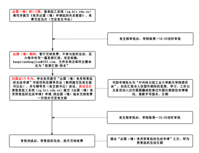 1.出国(境)学习研究工作人员中的预备党员,未加入外国国籍或取得外国长期居住权,在国(境)外无法办理转正手续的,回国后,除“出国(境)党员恢复组织生活申请”外,一并提交“出国(境)预备党员恢复预备期申请”,审批通过后,自向党组织提出书面恢复预备期申请之日起,经过1年时间的考察,符合党员条件的,可以办理转正手续;