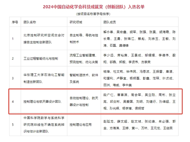 近日,2024中国自动化学会科技成就奖评审结果揭晓。皇冠博彩网址 控制理论与航天器设计团队荣获2024中国自动化学会科技成就奖(创新团队)。此次共评选出科技成就奖(创新团队)5项、科技成就奖(个人)2项。