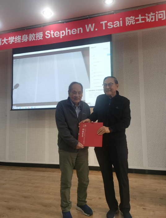 报告会后,杜善义院士进行了总结。他对Tsai教授的到来表示热烈欢迎,重点介绍了Tsai教授在复合材料力学领域的卓越贡献以及对国际复合材料力学界的深远影响,并向Tsai教授赠送了哈尔滨工业大学百年校庆纪念册。