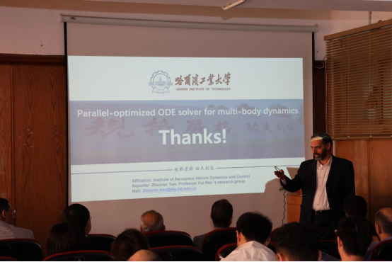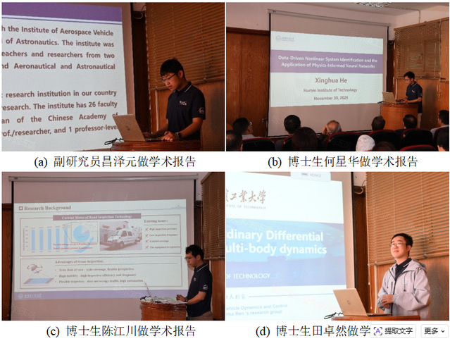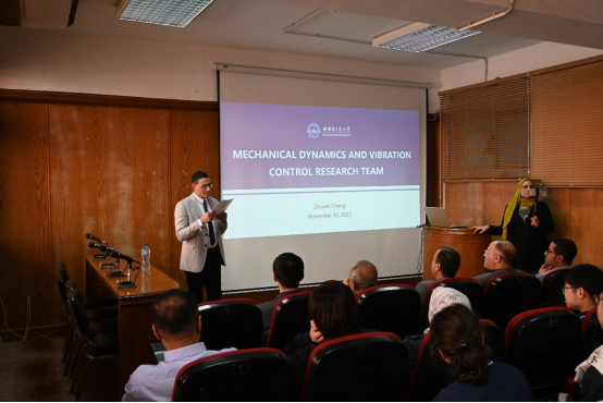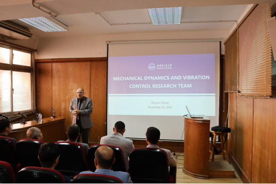 在学术报告环节,皇冠网址大全 昌泽元副研究员作了题为“Mechanical Dynamics and Vibration Control Research Team”的开场报告,介绍了飞行器动力学与控制研究所的主要研究方向及相关成果、合作前景与框架。皇冠网址大全 博士生何星华、田卓然、交通科学与工程学院博士生陈江川分别围绕“Data-driven nonlinear system identification and application of physical information neural networks”“Parallel-optimized Ordinary Differential Equation solver for multi-body dynamics”“Unmanned aerial vehicle road disease detection based on deep learning”前沿课题进行报告。系列报告内容紧扣工程技术挑战与学术创新,引发了埃方师生的高度关注与深入讨论,为后续联合科研奠定基础。
